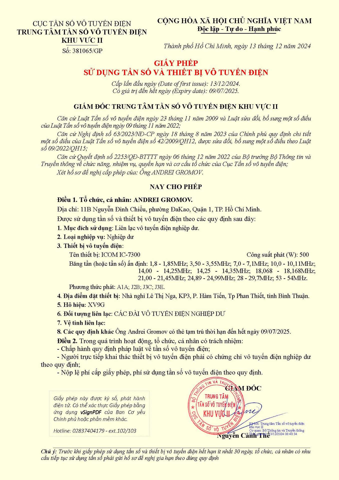On the form 1 if you want to apply in the Frequency department located in Ho Chi Minh (Thu Duc) you need to put the “permanent address” in the district 2 of Thao Dien. I have applied for license for European Ham radio operator using my address. Putting your address from your home country complicates the process.